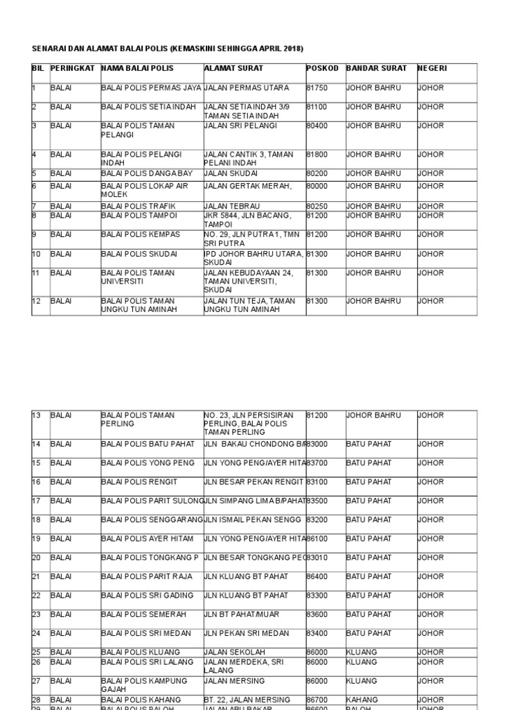 . SENARAI BORANG-BORANG POLIS YANG SERING DIGUNAKAN DI PEJABAT PERTANYAAN BALAI-BALAI POLIS POL 1. More Balai Polis Johor branches MAIN Balai Polis Johor Pondok Polis I-Park Balai Polis Permas Balai Polis Tenang Balai Polis Kayu Ara Pasong Pondok Polis Minyak Beku Pondok Polis Tun Ninam Shah Balai Polis Air Baloi Pondok Polis Taman Molek Balai Polis Air Tawar Dua Pondok Polis Kangkar Baru Balai. SENARAI BALAI BOMBA DAN PENYELAMAT NEGERI JOHOR 1.